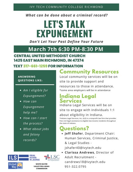 IvyTech Community College of Richmond, Indiana, is speaking about Expungements. “Let’s Talk Expungement. Don’t Let Your Past Define Your Future.” Fresh Start Housing, LLC will have a booth, stop by and visit.